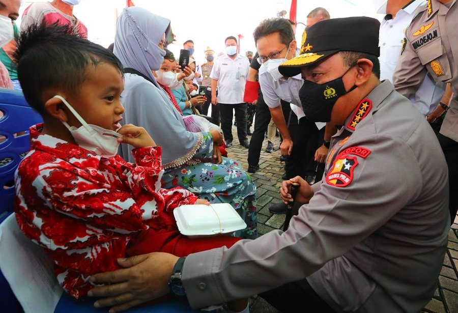 Kalimantan Barat - Menteri Kesehatan (Menkes) Budi Gunadi Sadikin bersama dengan Kapolri Jenderal Listyo Sigit Prabowo meninjau langsung vaksinasi serentak se-Indonesia dengan menghadiri secara langsung di Lapangan Kantor Bupati Kubu Raya, Kalimantan Barat (Kalbar), Rabu (19/1/2022).