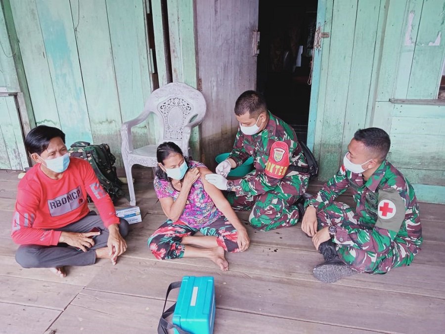 Anggota Satgas Yonif 144/JY bersinergi dalam percepatan penanganan Vaksinasi Covid-19 di Pulau Majang, Kecamatan Badau Kabupaten Kapuas Hulu, Kalbar.