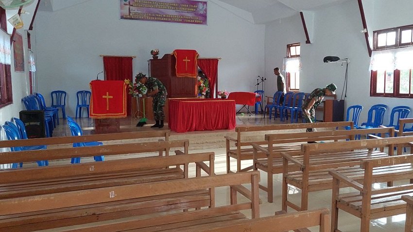 Satgas Kodim Maluku Yonarhanud 11/WBY, Pos Ramil Lisabata bersama masyarakat dan Jemaat Gereja (GPM) melaksanakan kegiatan Karya Bhakti membersihkan Gereja GPM Silo di Desa Rumah Mole Negeri Latea, Kecamatan Seram Utara Barat, Kabupaten Maluku Tengah, dalam rangka mewujudkan kenyamanan dalam beribadah serta menjaga kebersihan lingkungan tempat ibadah, Rabu (02/02/2022).