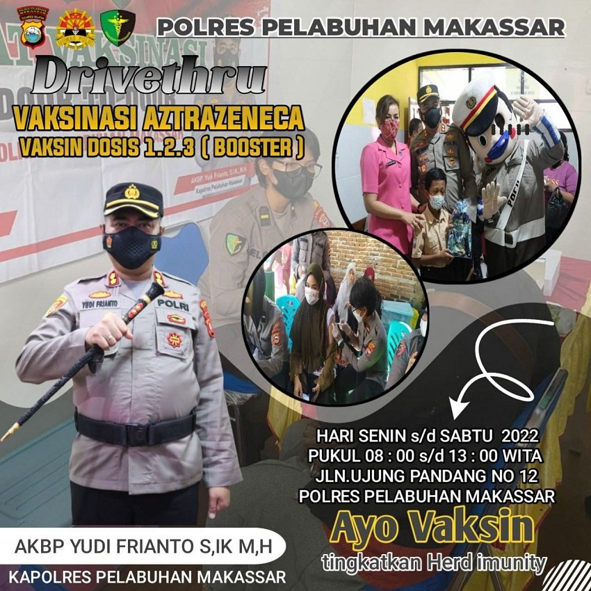 Dukung percepatan vaksinasi menuju Indonesia Herd Immunity dari Covid-19, Polres Pelabuhan Makassar menggelar vaksinasi massal melalui gerai drive thru dengan menyiapkan vaksin dosis 1, 2 dan Booster.