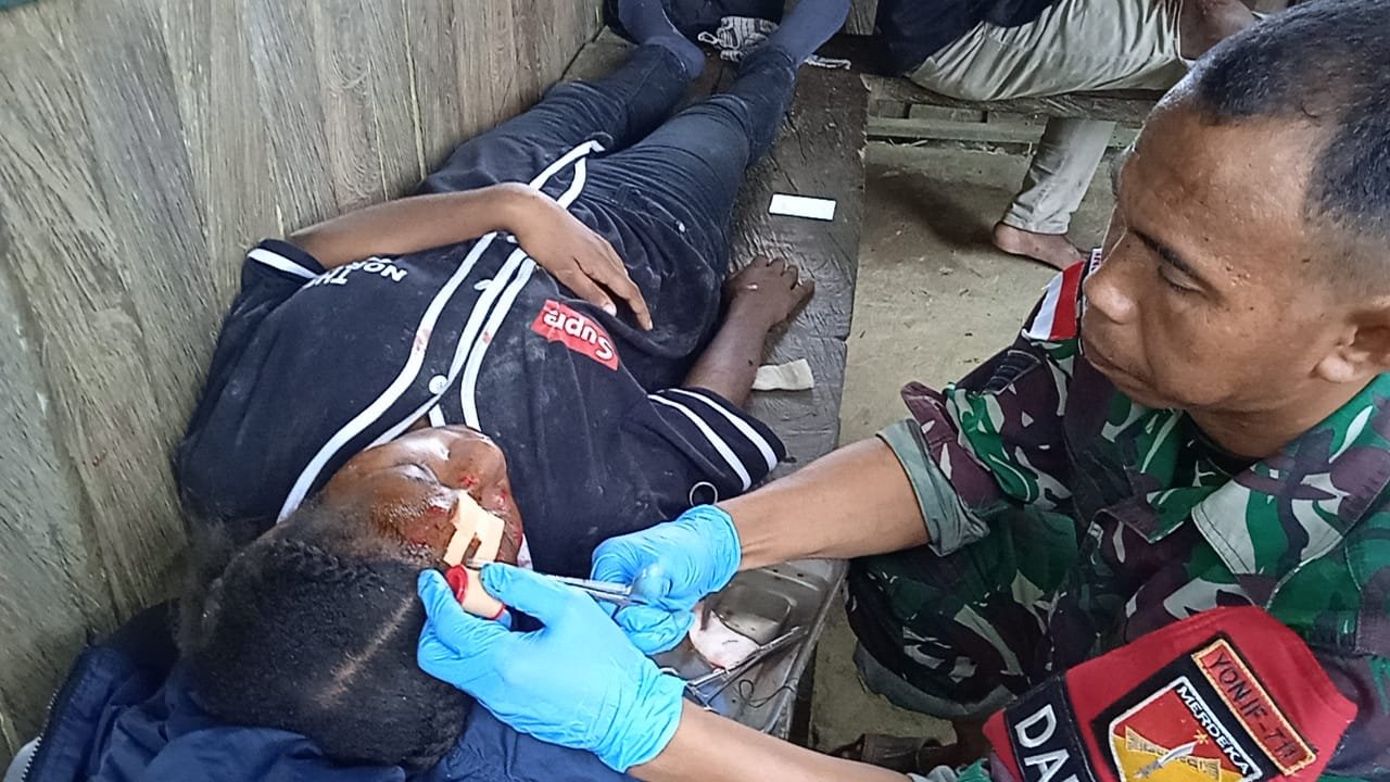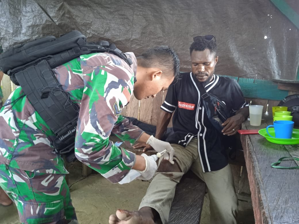 Tim Kesehatan Pos Sawiyatami Satgas Pamtas RI-PNG Yonif 711/Rks, memberikan pertolongan pertama kepada masyarakat yang terluka akibat terjatuh dari motor di Kampung Mannem, Distrik Arso Timur, Kabupate Keerom, Papua, Kamis (17/02/2022).