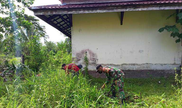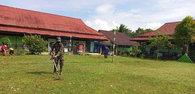 Satgas Pamtas RI-Malaysia Yonif Mekanis 643/Wns karya bakti secara gotong royong membersihkan lingkungan sekolah di SDN 06 Sei Takek Kecamatan Jagoi Babang, Kabupaten Bengkayang.