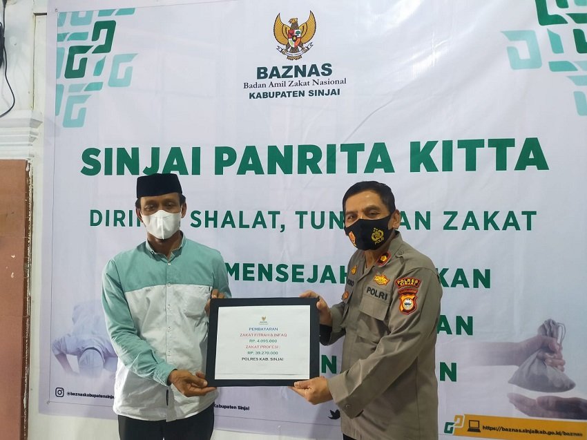 Kapolres Sinjai yang diwakili oleh Wakapolres Sinjai Kompol Joko Sutrisno didampingi Kasi Keuangan Polres Sinjai Ipda Firman Rahim selaku Bendahara Unit Pengumpul Zakat (UPZ) Polres Sinjai menyerahkan Zakat Fitrah dan Zakat Profesi personel Polres Sinjai, di Kantor Baznas Kabupaten Sinjai, Jalan Persatuan Raya, Kelurahan Biringere, Kecamatan Sinjai Utara, Kabupaten Sinjai, Rabu (27/04/2022) siang.