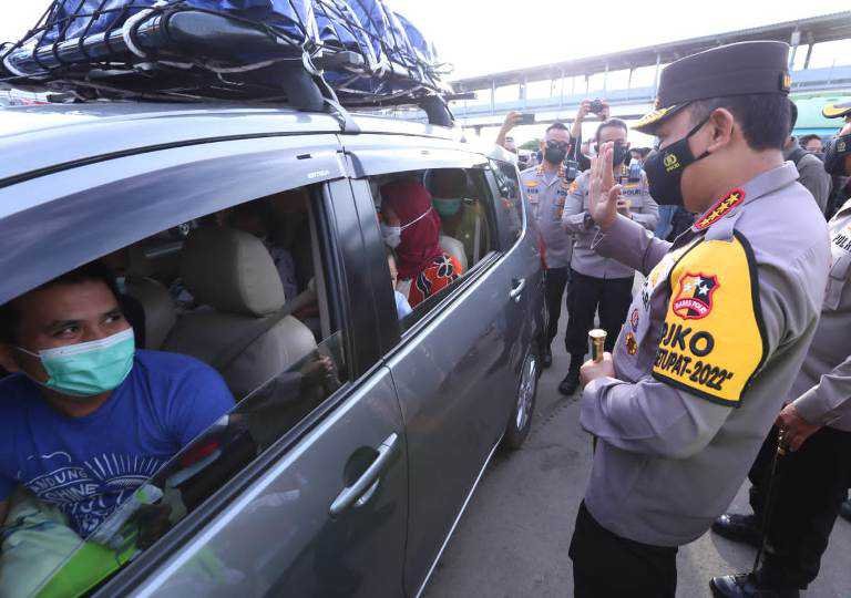 Kapolri Jenderal Listyo Sigit Prabowo meninjau arus mudik di Pelabuhan Merak, Banten, Sabtu, (30/04/2022). Dalam tinjauannya, Kapolri memantau baik melalui udara dan mendengarkan langsung pemaparan langsung dari otoritas setempat terkait dengan penanganan serta pengendalian arus mudik.