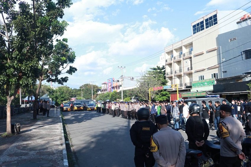 Kepolisian Resor (Polres) Pelabuhan Makassar menggelar Apel Siaga dalam rangka patroli pemantauan takbir keliling dan pengamanan malam takbiran pada malam Idul Fitri 1443H/2022M di depan Mapolres tersebut, Minggu (01/05/2022).