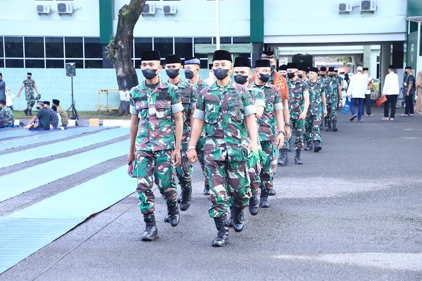 Kepala Staf Kodam I/BB (Kasdam) Brigjen TNI Purwito Hadi Wardhono beserta keluarga melaksanakan sholat Idul Fitri 1 Syawal 1443/H di lapangan hitam Makodam I/BB, Jl. Gatot Subroto Medan, Senin (02/05/2022).