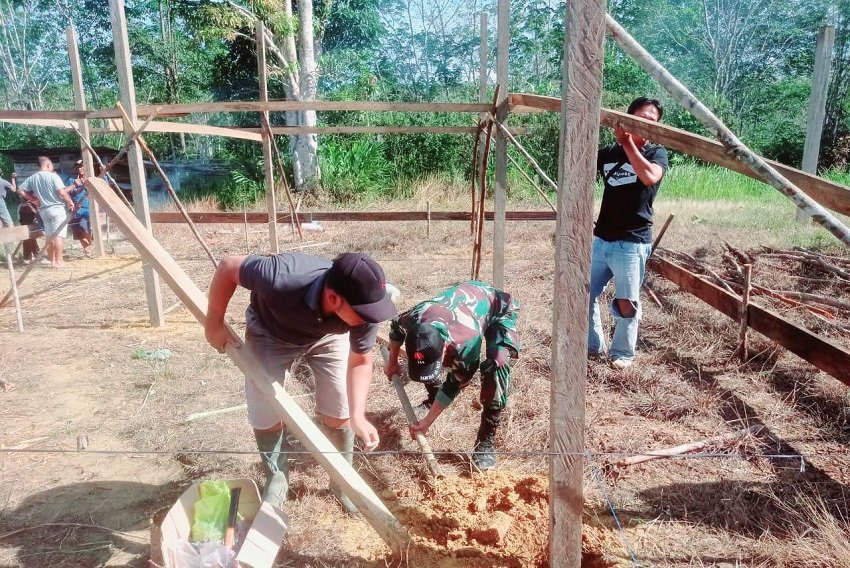 Pratu Erry beserta dua rekannya membantu warga dalam pembuatan rumah mulai dari pengangkatan kayu dan penggalian lobang serta kami diarahkan oleh tukangnya sendiri sehingga terbentuk kerangka bangunan rumah, harapannya rumah warga ini cepat selesai dan bisa digunakan oleh warga dan bisa berkumpul lagi dengan anak istri dan keluarga.