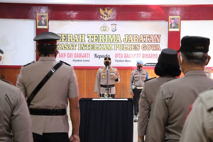 Kepolisian Resor Gowa melaksanakan kegiatan upacara serah terima jabatan Kasat Intelkam Polres Gowa, Selasa (17/05/22) di Aula Endra Darmalaksana Mapolres setempat yang dipimpin langsung Kapolres Gowa AKBP Tri Goffarudin P, SIK, MH.