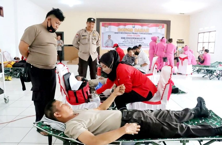 Menyambut Hari Ulang Tahun (HUT) Bhayangkara ke-76, Polres Toraja Utara (Torut) gelar kegiatan donor darah dengan menggandeng Unit Donor Darah Palang Merah Indonesia (UDD PMI) Kota Palopo yang berlangsung di Aula Polres Toraja Utara, Selasa (07/06/2022).