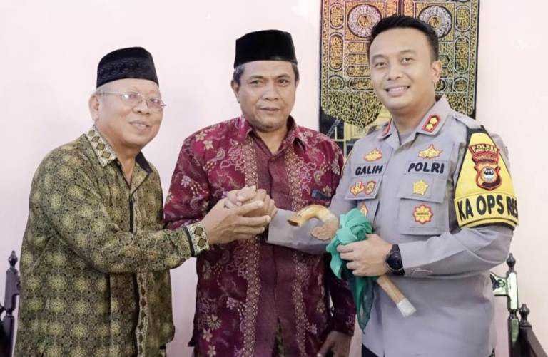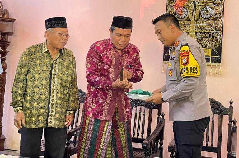 Kapolres Luwu Utara AKBP Galih Indragiri menerima tanda persahabatan dari tokoh adat yang juga mantan anggota DPRD Luwu Utara Andi Suriadi Opu Topasolongi berupa Benda Pusaka.