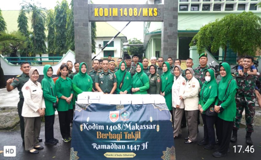 SOROTMAKASSAR -- MAKASSAR, Komandan Kodim 1408/Makassar, Letkol Kav Ino Dwi Setyo Darmawan, SE, M.Tr.Han., memimpin langsung kegiatan berbagi takjil kepada masyarakat di depan Makodim, Jalan Lanto Dg. Pasewang, Kecamatan Mamajang, Selasa (24/2/2026). Kegiatan yang digelar dalam rangka menyemarakkan Ramadhan 1447 H ini menjadi wujud nyata kepedulian sosial TNI kepada masyarakat. Didampingi Ketua Persit Kartika Candra Kirana Cabang XI Ny. Ayu Ino Dwi, kehadiran pimpinan satuan di tengah warga menghadirkan suasana hangat dan penuh kebersamaan. Aksi tersebut tidak hanya menjadi kegiatan seremonial, tetapi juga sarat makna kebangsaan. Momentum Ramadhan dimanfaatkan sebagai ruang mempererat silaturahmi dan memperkuat persatuan.