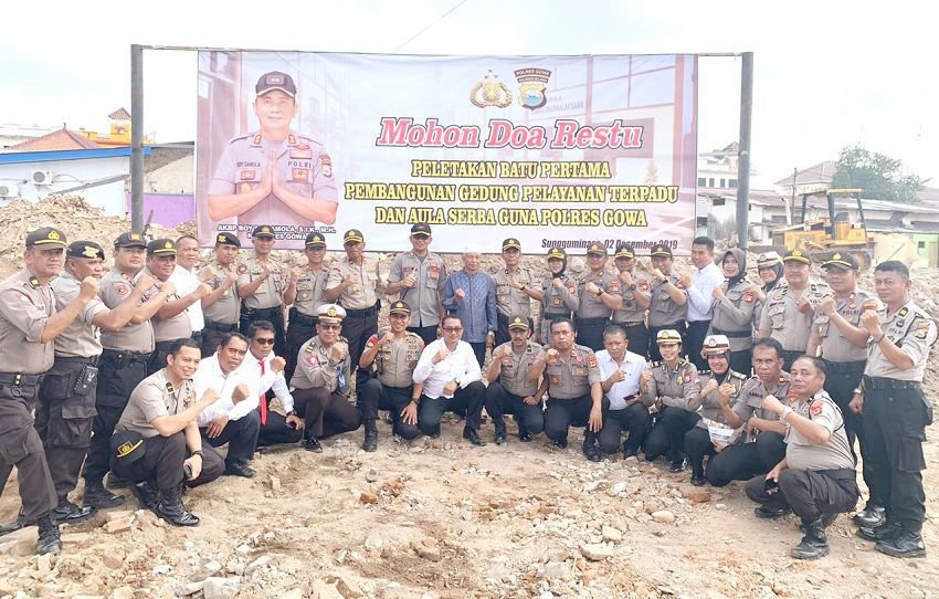 Bertempat di lahan bekas Asrama Polres Gowa, Kapolres Gowa AKBP Boy F.S Samola, SIK, MH melakukan peletakan batu pertama pembangunan Gedung Pelayanan Terpadu dan Aula Serbaguna Polres Gowa, Senin (02/12/2019) pagi.