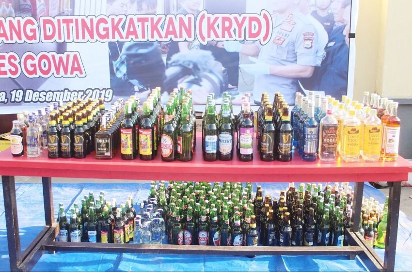 Jajaran kepolisian Polres Gowa melakukan pemusnahan barang bukti berbagai jenis minuman keras (Miras) di halaman Kantor Polres Gowa, Kamis (19/12/2019) pagi.