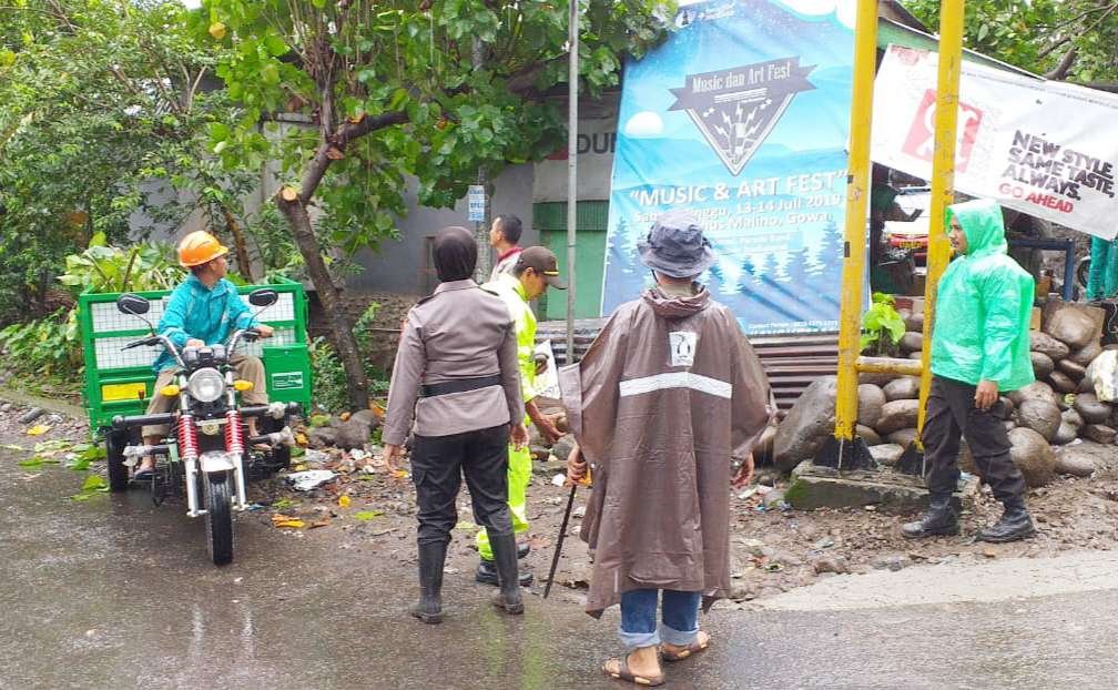 Sejumlah warga bersama Polri dan TNI sedang gotong royong melaksanakan kerja bakti di Kampung Paranglabbua, Kelurahan Bontoparang, Kecamatan Parangloe, Kabupaten Gowa pada Sabtu (01/02/2020).