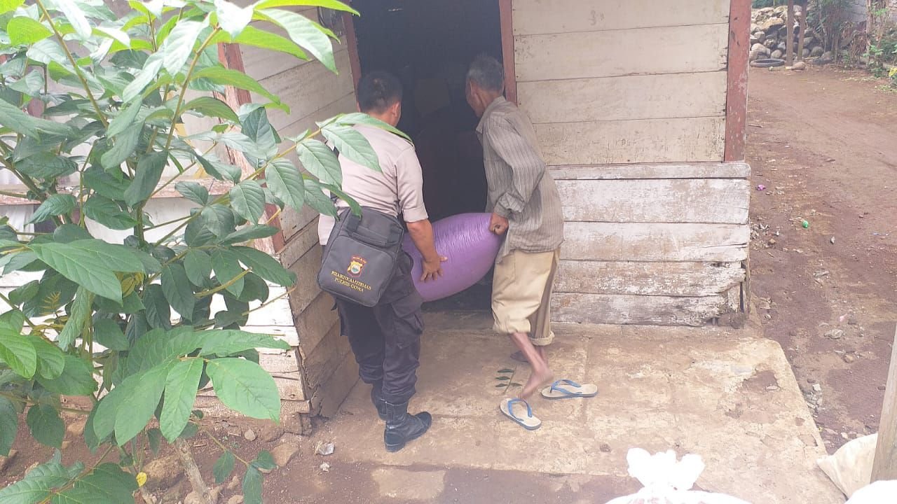 Bripka Suherman tidak menunggu lama ketika melihat warganya yang sudah berumur sendirian mengangkat beberapa tumpukan karung gabah ke dalam rumahnya sehingga ia segera ikut membantu.