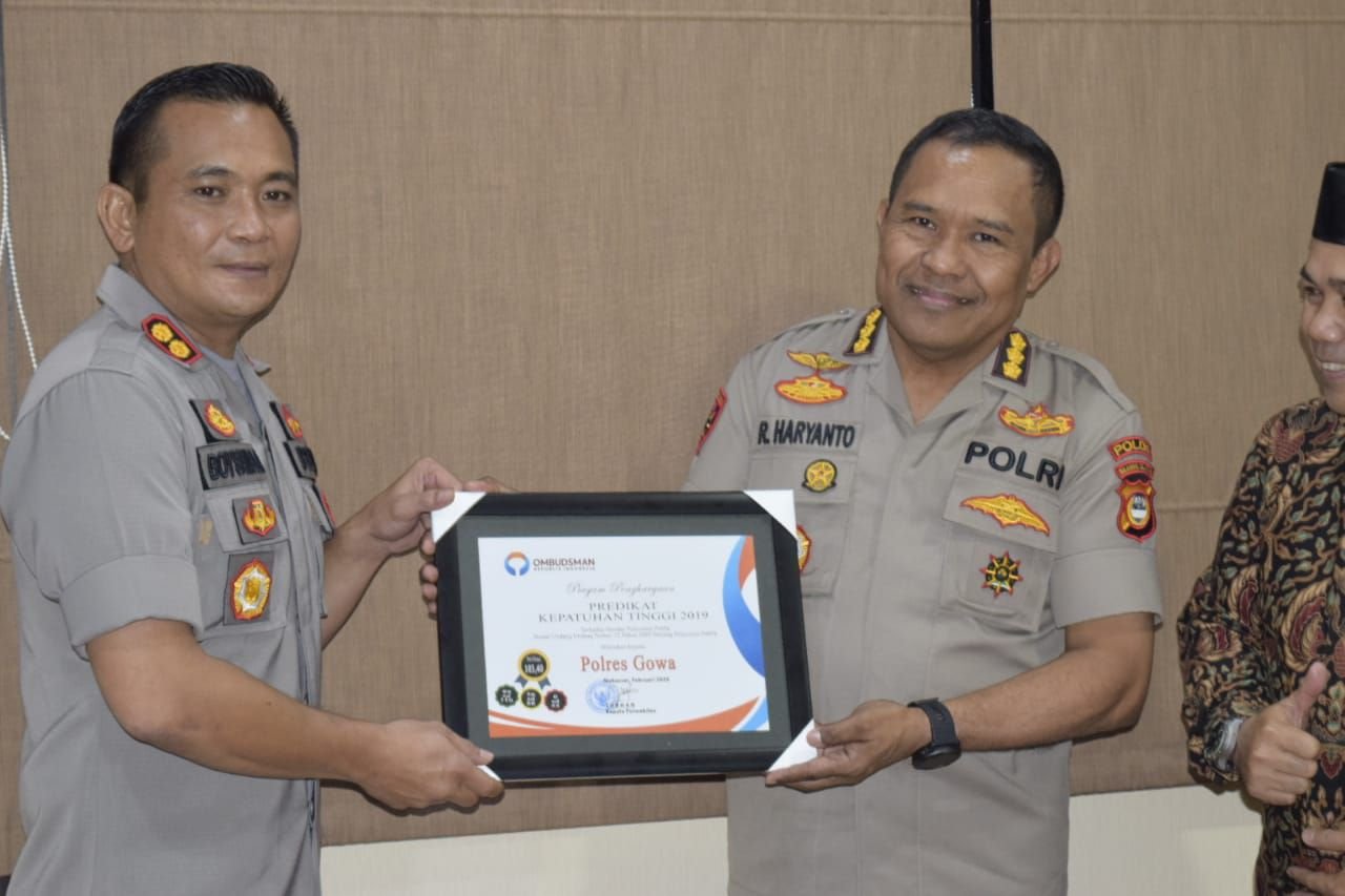 Satu lagi prestasi yang membanggakan jajaran Polres Gowa, Sulawesi Selatan. Senin (10/2/2020) siang di hadapan Pejabat Utama Polda Sulawesi Selatan, Kapolres Gowa, AKBP Boy Samola menerima piagam penghargaan kategori predikat kepatuhan tinggi dari Ombudsman Republik Indonesia.