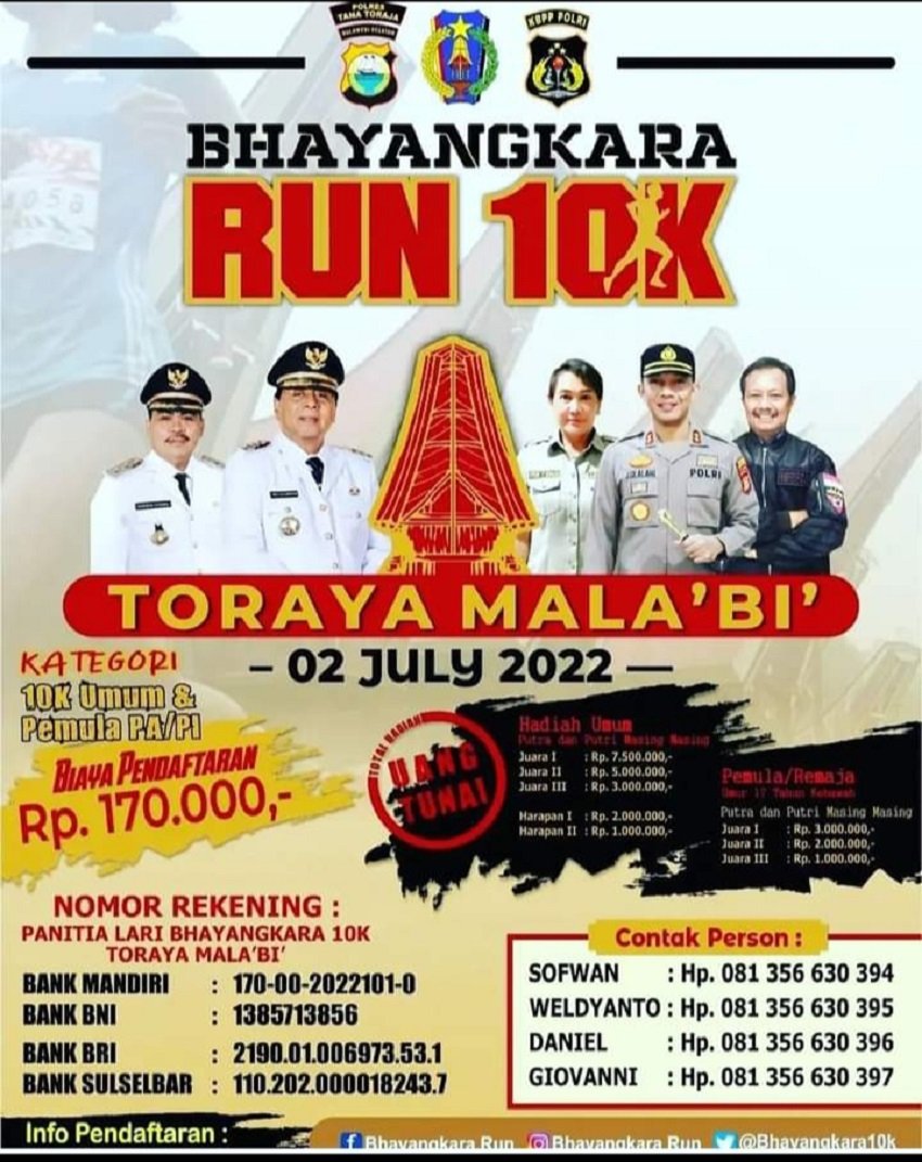 Bhayangkara 10K Toraya Mala'bi akan dihelat 2 Juli 2022, dan Festival musik bambu 29-30 Juni 2022 dalam rangka memperingati HUT Bhayangkara ke-76 Tahun 2022. Kegiatan ini terlaksana atas kolaborasi Pemda Tana Toraja, Keluarga Besar Putra Putri (KBPP) Polri, bersama Polres Tana Toraja.