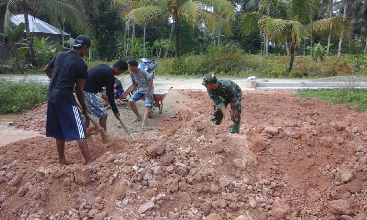 Serma Takruni, Babinsa dari Koramil 1403 Sawerigading-12 Bone-Bone Kabupaten Luwu Utara(Lutra), bersama warga binaan bergotong royong meratakan timbunan jalan tani di Desa Sukamukti, Kecamatan Sukamaju Selatan.