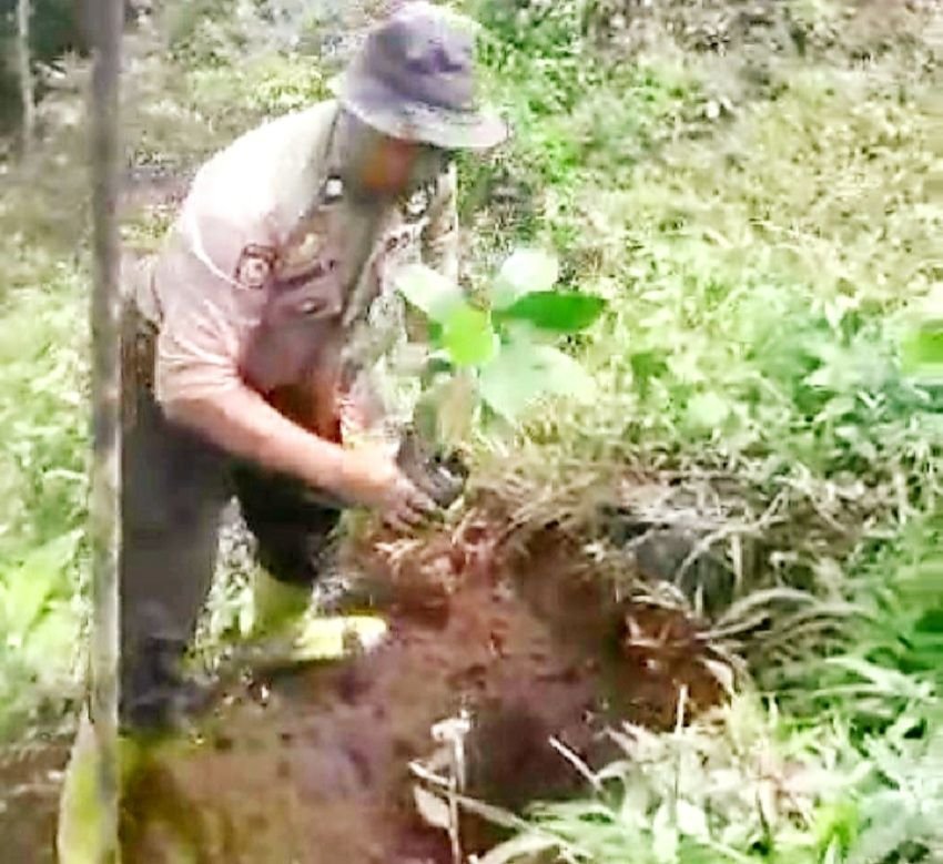 Untuk menjaga kelestarian lingkungan, Ka SPK III (Kepala Sentra Pelayanan Kepolisian Regu Tiga) Polsek Tombolopao Gowa Aiptu Rustam Jaya menanam pohon di lereng pegunungan, Selasa (07/01/2020).