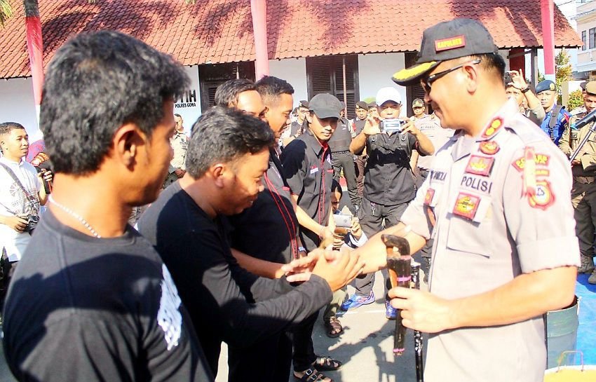 Polres Gowa menerima ratusan jenis senjata tajam (sajam) dari komunitas anak pasar Minasa Maupa secara simbolis ke Polres Gowa. Kamis (19/12/2019).