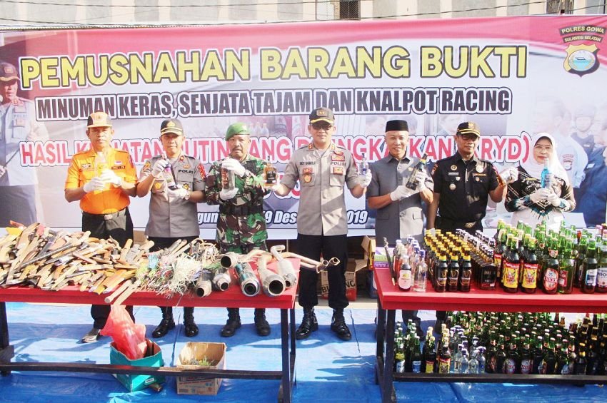Jajaran kepolisian Polres Gowa melakukan pemusnahan barang bukti berbagai jenis minuman keras (Miras) di halaman Kantor Polres Gowa, Kamis (19/12/2019) pagi.