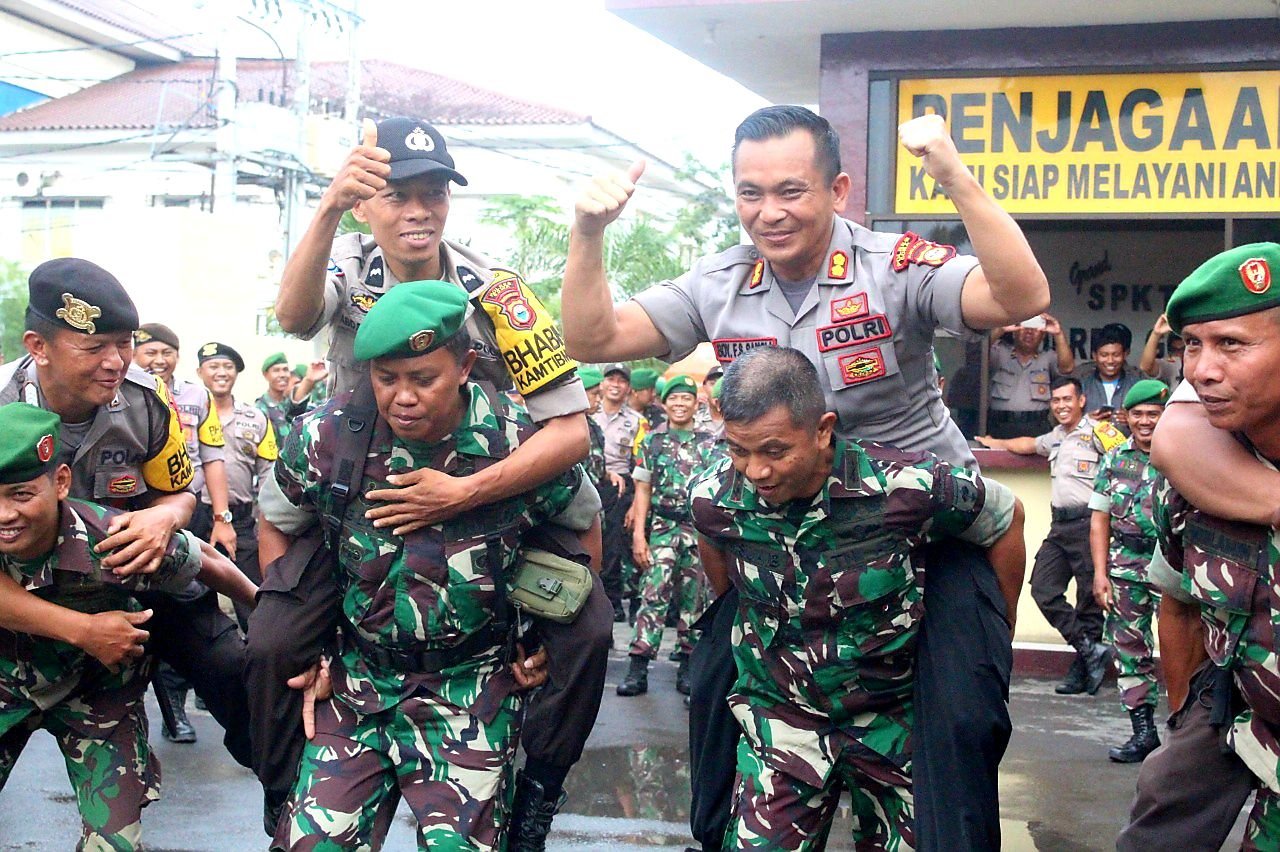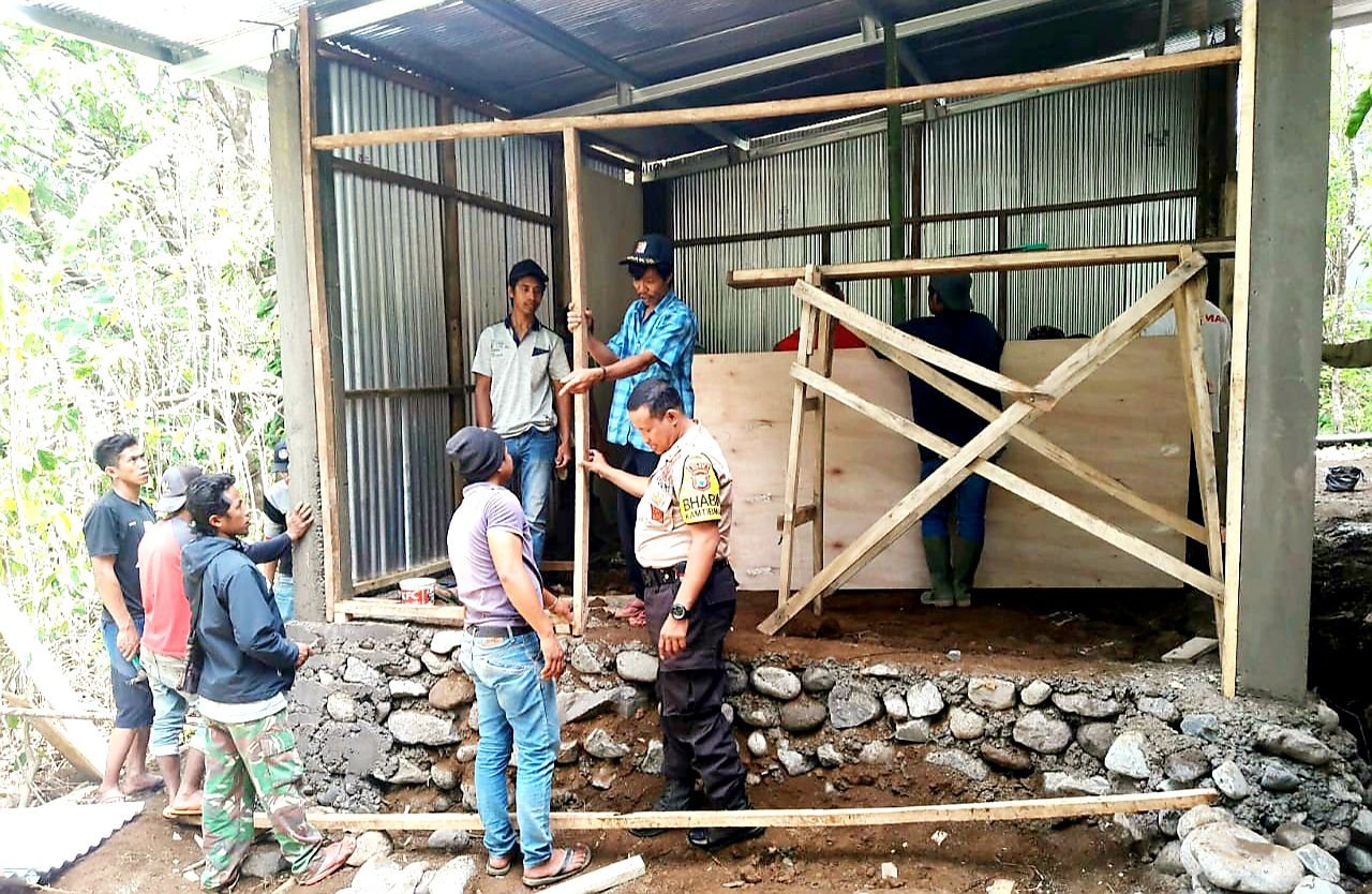 Bhabinkamtibmas Malino Polres Gowa Bripka Ruslan Machmud melaksanakan kegiatan gotong royong pembangunan rumah milik Dg Baco, Selasa (03/12/2019).